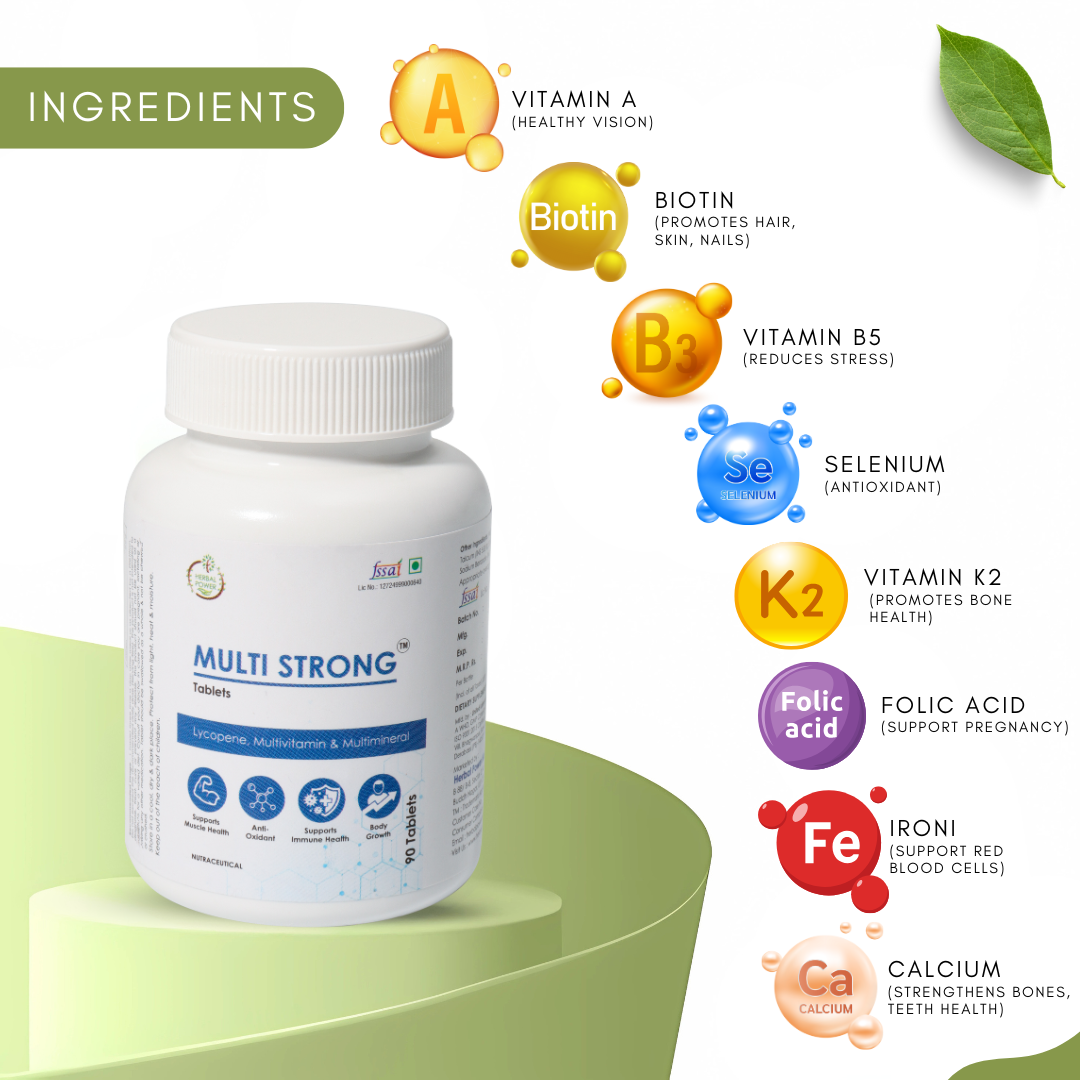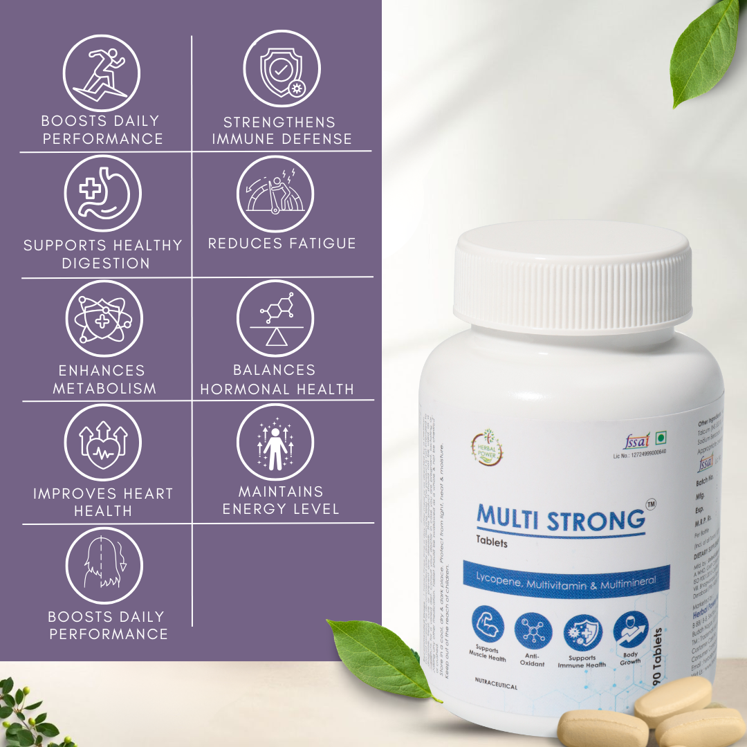 Multi Strong is a daily multivitamin and mineral supplement formulated to complement modern lifestyles by supporting overall nutrition, daily vitality, and general well-being. It provides a balanced combination of essential vitamins, minerals, and plant-based ingredients to help meet everyday nutritional needs.