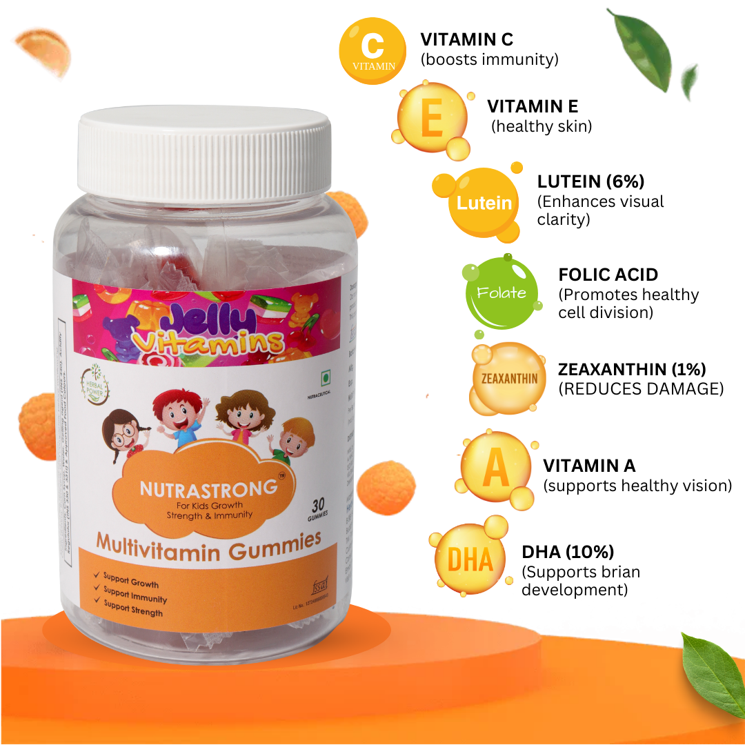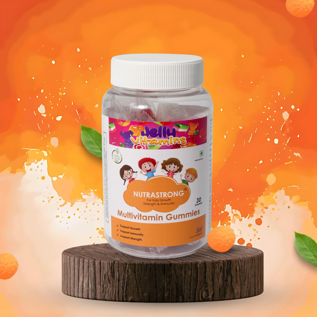 NutraStrong Kids Multivitamin Gummies provide a fun and flavourful way to support your child’s daily nutrition and overall well-being. Packed with essential Vitamins A, C, D, and E, these gummies help strengthen the immune system, promote healthy vision, and support skin health. Key minerals like Calcium, Magnesium, and Zinc contribute to strong bones, proper muscle function, and cognitive development. Designed for growing kids, this formula helps fill nutritional gaps while delivering a delicious taste they’ll love. Made with natural flavours and carefully selected ingredients, Nutra Strong makes daily wellness simple, ensuring your child gets the vital nutrients they need for healthy growth, energy, and development.